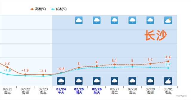 比如長沙,自2月21日14時以后,氣溫持續(xù)在0℃以下運(yùn)行,已超過70個小時,2月下旬連續(xù)如此長的低溫,幾乎前所未見。2月的最后幾天,長沙最高氣溫將不超過6℃,今天甚至不到0℃,常年同期平均最高氣溫在10℃以上,比常年冷得多。