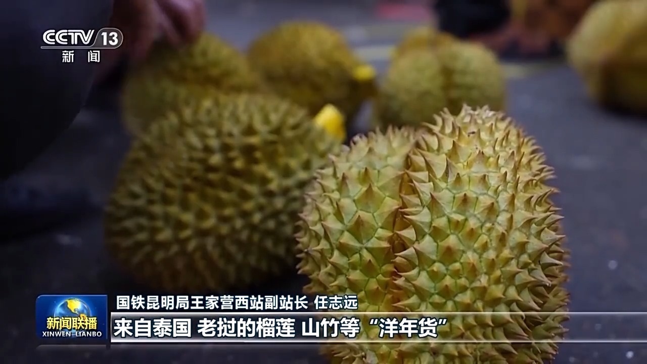 國鐵昆明局王家營西站副站長 任志遠(yuǎn):今年以來,車站進出口貨物明顯增加,來自泰國、老撾的榴蓮、山竹等“洋年貨”源源不斷運抵。國內(nèi)的“國貨潮牌”陸續(xù)運往東南亞國家。