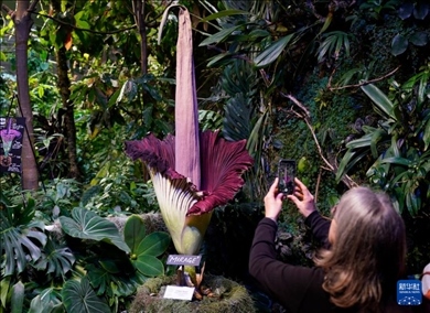 美國(guó)舊金山加州科學(xué)博物館內(nèi)一株開花的巨魔芋吸引大批游客觀賞。巨魔芋原產(chǎn)于印度尼西亞蘇門答臘島的熱帶雨林,每隔7至10年開花一次,每次開花時(shí)間只有24至36個(gè)小時(shí)。