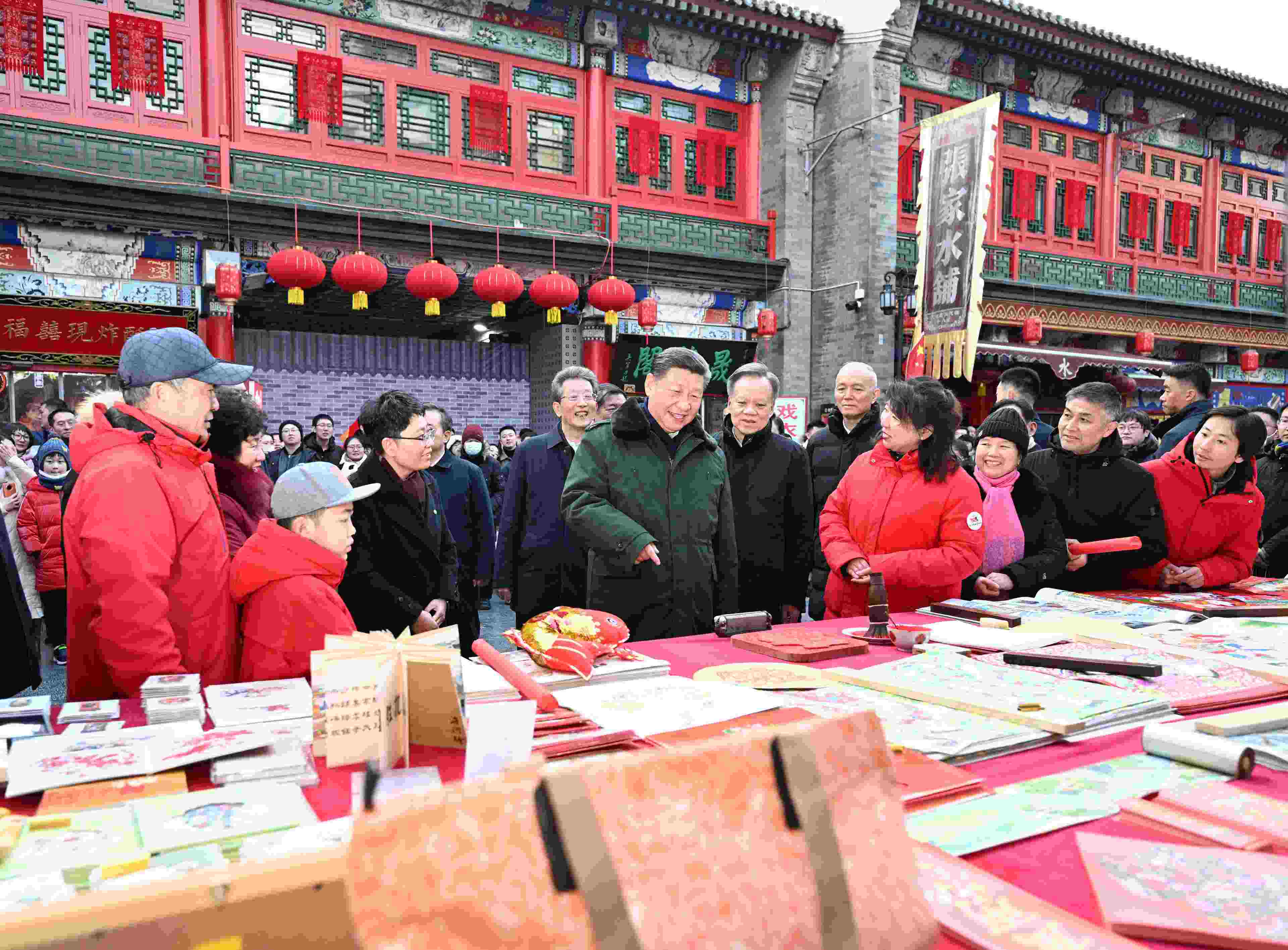 △ 2024年2月1日,習(xí)近平總書(shū)記在天津古文化街考察時(shí),同店鋪員工和現(xiàn)場(chǎng)群眾互動(dòng)交流。