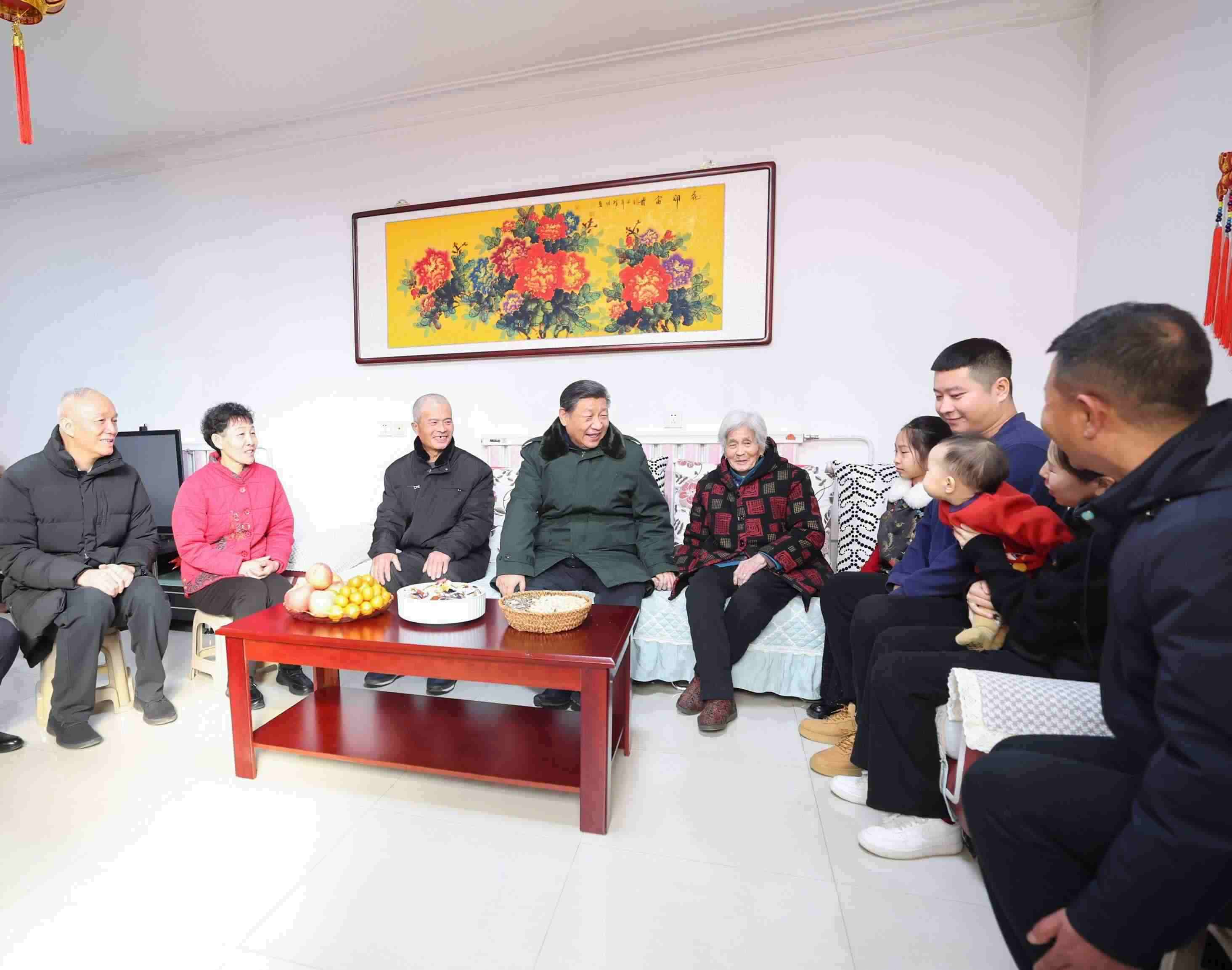 △ 2024年2月1日,習(xí)近平總書(shū)記在天津市西青區(qū)辛口鎮(zhèn)第六埠村考察時(shí),同村民杜洪剛一家人親切拉家常。