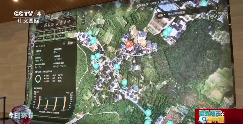 五四村的村干部還帶來了更多驚喜:“帶你去看看我們整個村的數(shù)字鄉(xiāng)村是如何治理的。整個一張圖里面所展示的是我們整個村的發(fā)展。這個圖是2019年建設(shè)的,也是整個浙江省在五四村率先打造的‘一圖全面感知’,總共有全縣的各個部門58個、282類數(shù)據(jù),總共有12個這樣的數(shù)據(jù)接口連入到了5個城市大腦應(yīng)用,形成了這樣一個時時可以感知農(nóng)村的生產(chǎn)、生活、生態(tài)詳情的數(shù)字化體系?!?