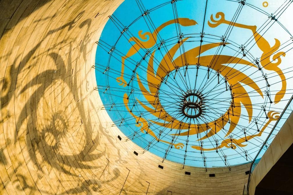 這是陽(yáng)光透過(guò)成都金沙遺址博物館陳列館穹頂,在墻壁上投下太陽(yáng)神鳥(niǎo)造型的影子(2022年3月10日攝)。新華社發(fā)(張艷攝)