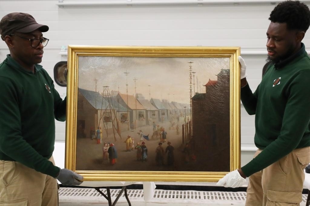3月11日,在法國(guó)巴黎近郊的凡爾賽宮,工作人員準(zhǔn)備打包油畫(huà)《南京的集市》。在2024年中法建交60周年暨中法文化旅游年之際,凡爾賽宮和故宮博物院將于4月至6月在故宮共同舉辦“凡爾賽宮與紫禁城”展覽。新華社記者高靜攝