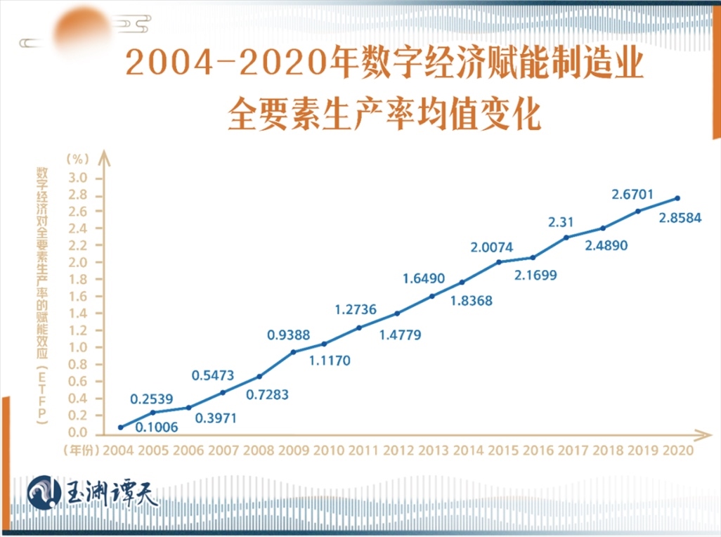 有學者做過測算,從2004年開始到2021年,數(shù)字經濟賦能制造業(yè)全要素生產率效能呈逐年上升的趨勢,且近年來,賦能均值達到了最高點。