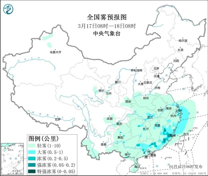今晨,江蘇、上海、浙江南部、江西中部、福建、廣東、廣西北部、貴州中部等地部分地區(qū)出現(xiàn)大霧天氣,局地能見度不足200米。預計今天上午,上述地區(qū)的大霧天氣還將持續(xù),局地有能見度不足200米的強濃霧。此外,黃海南部海域、東海偏西海域、臺灣海峽將有能見度不足10公里的霧,其中東海西部海域、長江口附近海域、杭州灣附近海域、浙江沿岸海域、福建北部沿岸海域將有能見度不足1公里的大霧。中央氣象臺今晨繼續(xù)發(fā)布大霧黃色預警。