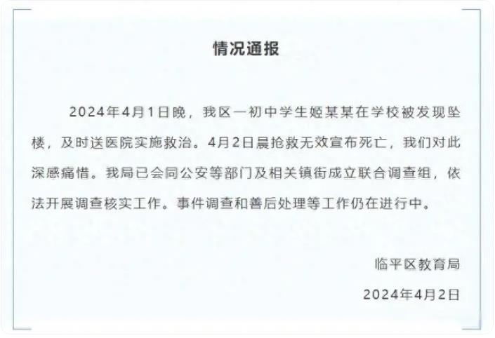 ·杭州臨平教育局通報“一初中學生在學校墜樓死亡”:成立聯(lián)合調(diào)查組。