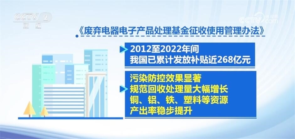 我國設(shè)立“廢棄電器電子產(chǎn)品處理基金”,用于補貼回收處理廢棄電器電子產(chǎn)品。根據(jù)《廢棄電器電子產(chǎn)品處理基金征收使用管理辦法》,2012至2022年間,我國已累計發(fā)放補貼近268億元,污染防控效果顯著,規(guī)范回收處理量大幅增長,銅、鋁、鐵、塑料等資源產(chǎn)出率穩(wěn)步提升。