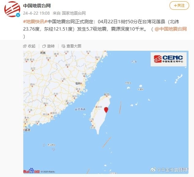 央視網(wǎng)消息:中國地震臺網(wǎng)正式測定:04月22日18時(shí)50分在臺灣花蓮縣(北緯23.76度,東經(jīng)121.51度)發(fā)生5.7級地震,震源深度10千米。