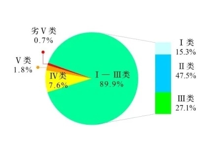 1—3月,3641個國家地表水考核斷面中,水質(zhì)優(yōu)良(Ⅰ—Ⅲ類)斷面比例為89.9%,同比上升0.8個百分點;劣Ⅴ類斷面比例為0.7%,同比上升0.1個百分點。主要污染指標(biāo)為化學(xué)需氧量、高錳酸鹽指數(shù)和總磷。