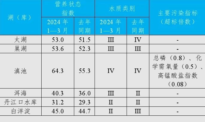 1—3月,監(jiān)測的201個重點湖(庫)中,水質(zhì)優(yōu)良(Ⅰ—Ⅲ類)湖庫個數(shù)占比82.1%,同比上升1.1個百分點;劣Ⅴ類水質(zhì)湖庫個數(shù)占比4.5%,同比下降0.1個百分點。主要污染指標(biāo)為總磷、化學(xué)需氧量和高錳酸鹽指數(shù)。181個監(jiān)測營養(yǎng)狀態(tài)的湖(庫)中,中度富營養(yǎng)的9個,占5.0%;輕度富營養(yǎng)的31個,占17.1%;其余湖(庫)為中營養(yǎng)或貧營養(yǎng)狀態(tài)。其中,太湖和巢湖水質(zhì)均為良好、輕度富營養(yǎng);滇池為輕度污染、中度富營養(yǎng),主要污染指標(biāo)為總磷、化學(xué)需氧量和高錳酸鹽指數(shù);洱海水質(zhì)良好、中營養(yǎng);丹江口水庫和白洋淀水質(zhì)均為優(yōu)、中營養(yǎng)。