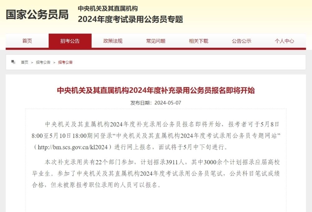 中央機(jī)關(guān)及其直屬機(jī)構(gòu)2024年度補(bǔ)充錄用公務(wù)員報(bào)名即將開(kāi)始