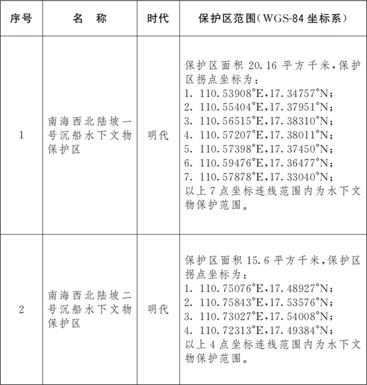 ·國務(wù)院核定公布南海西北陸坡一號、二號沉船水下文物保護區(qū)名單。