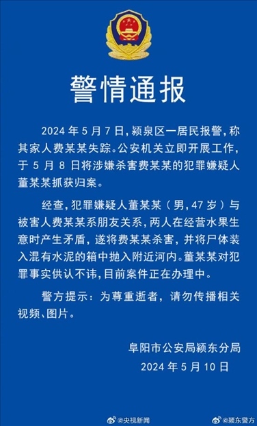 ·安徽警方通報“水泥封尸”事件:男子因生意矛盾殺害朋友裝水泥箱中拋尸。