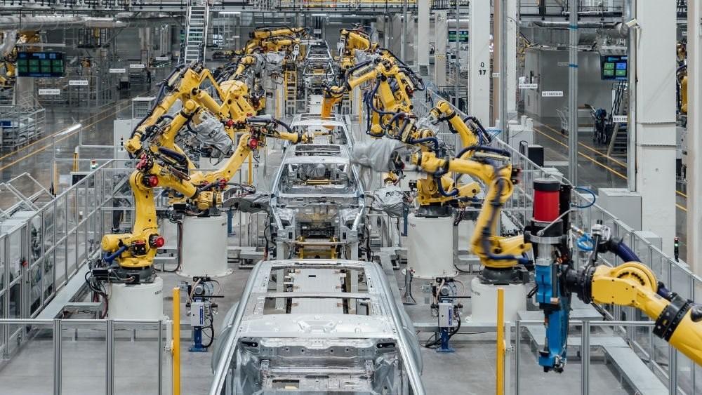 這是在重慶市兩江新區(qū)拍攝的賽力斯汽車超級工廠焊裝車間生產線(2024年2月26日攝,無人機照片) 新華社發(fā)(高彰 攝)。