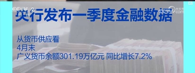 央行數(shù)據(jù)顯示,從貨幣供應(yīng)看,4月末,廣義貨幣余額301.19萬億元,同比增長7.2%。