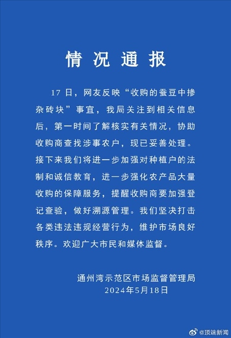 ·網(wǎng)友反映“收購的蠶豆中摻雜磚塊”,南通發(fā)布情況通報(bào)。