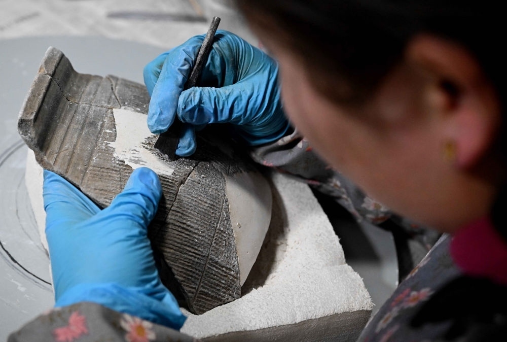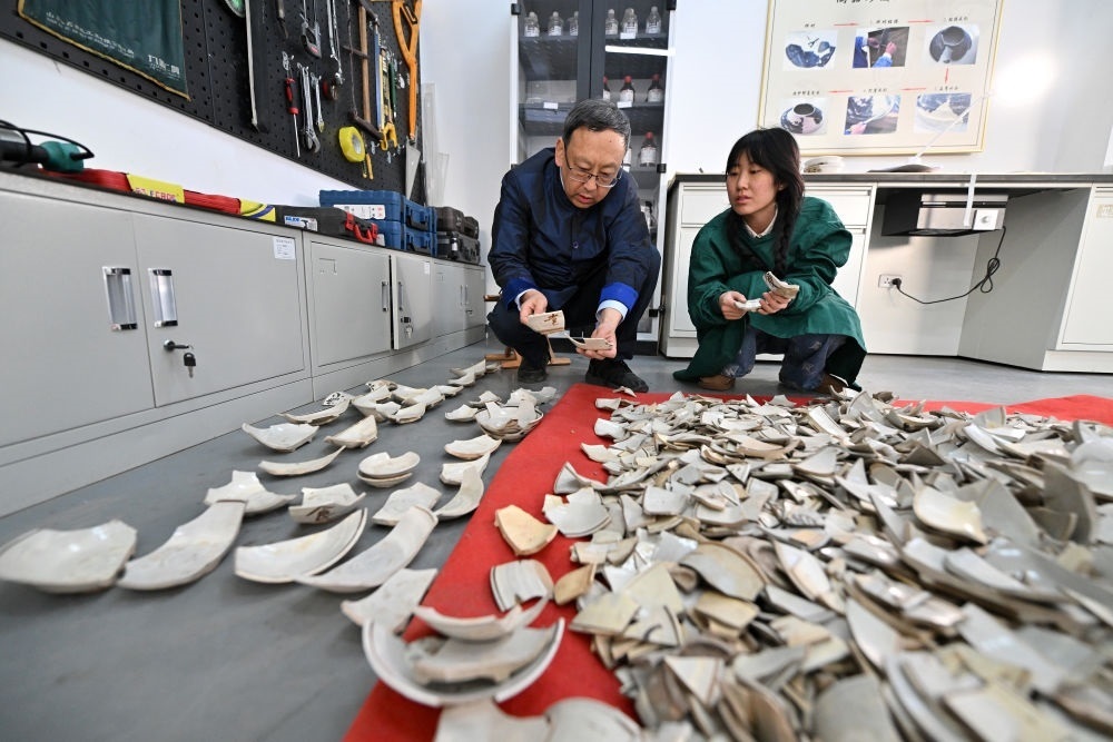 2024年2月23日,在中國社會科學院考古研究所安陽工作站,工作人員在整理修復(fù)殷墟洹北商城出土的陶片。