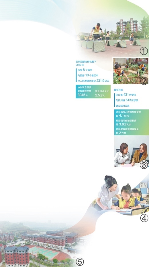 圖①:孩子們在上體育課。人民網(wǎng)記者 王 波攝 圖②:孩子們在上勞動課。圖③:之江小學(xué)教師(右)在浙江交流學(xué)習(xí)。受訪者供圖 圖④:老師在為五年級一班的孩子輔導(dǎo)作業(yè)。圖⑤:之江小學(xué)校園。圖②④⑤均為本報記者宋豪新攝數(shù)據(jù)來源:農(nóng)業(yè)農(nóng)村部、浙江省教育廳、四川省教育廳
