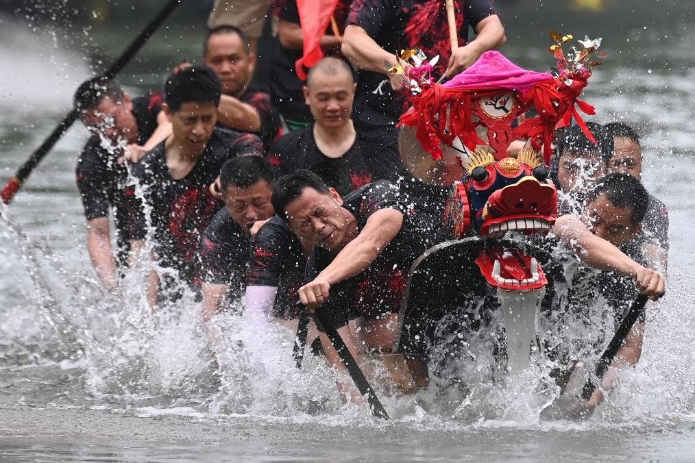 2023年6月22日,村民在杭州西溪國(guó)家濕地公園的蔣村龍舟勝會(huì)上劃龍舟。蔣村龍舟勝會(huì)于2011年被列入國(guó)家級(jí)非物質(zhì)文化遺產(chǎn)名錄。