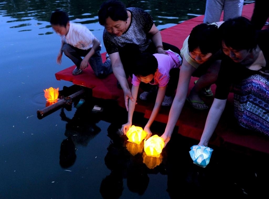 2011年6月4日,游客在北京龍?zhí)豆珗@參加端午節(jié)“祈福納吉”放河燈活動(dòng)。