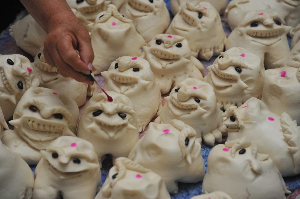 2016年6月7日,在山西晉南運(yùn)城市新絳縣澤掌村一家蒸饃店,一名村民在給蒸好的“老虎饃”“點(diǎn)紅”。端午節(jié)臨近,山西晉南地區(qū)的城鄉(xiāng)居民開(kāi)始制作或購(gòu)買老虎造型的晉南花饃“老虎饃”,用來(lái)在端午節(jié)敬奉先祖,祈福平安吉祥。晉南花饃已入選國(guó)家級(jí)非物質(zhì)文化遺產(chǎn)名錄。