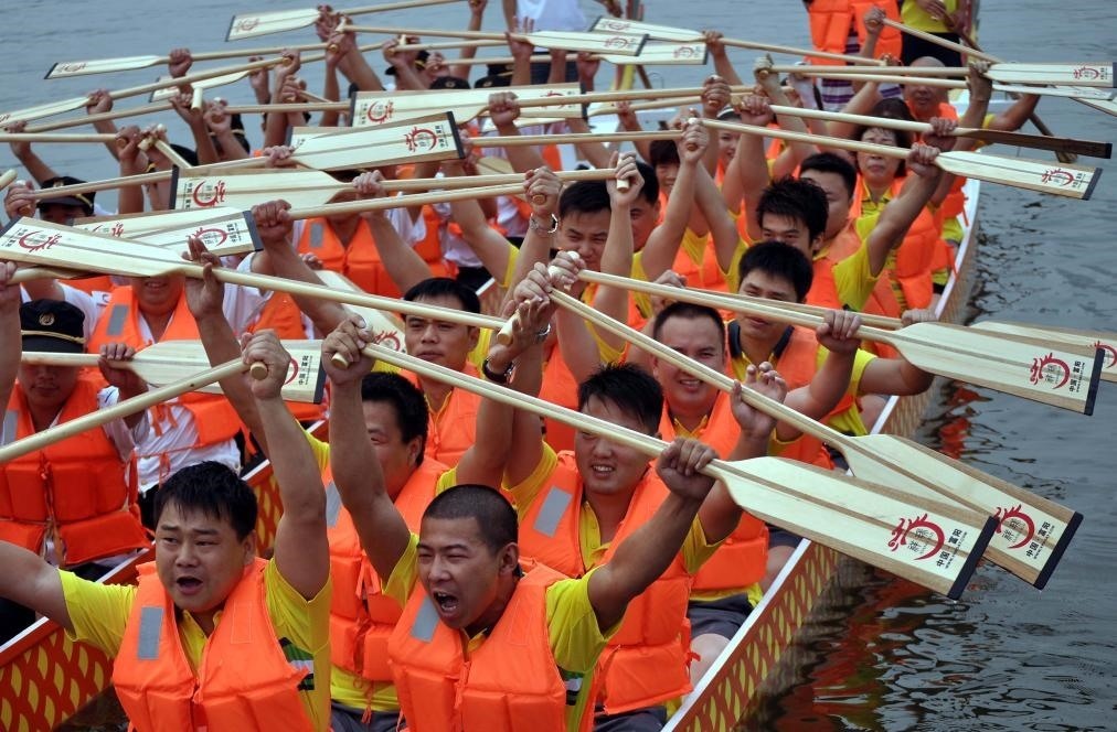 2011年6月6日,在河南省鄭州東區(qū)的如意湖上,舉行了一場(chǎng)龍舟挑戰(zhàn)賽,兩支龍舟隊(duì)的選手們?cè)诒荣愰_(kāi)始前舉槳大吼以壯氣勢(shì)。