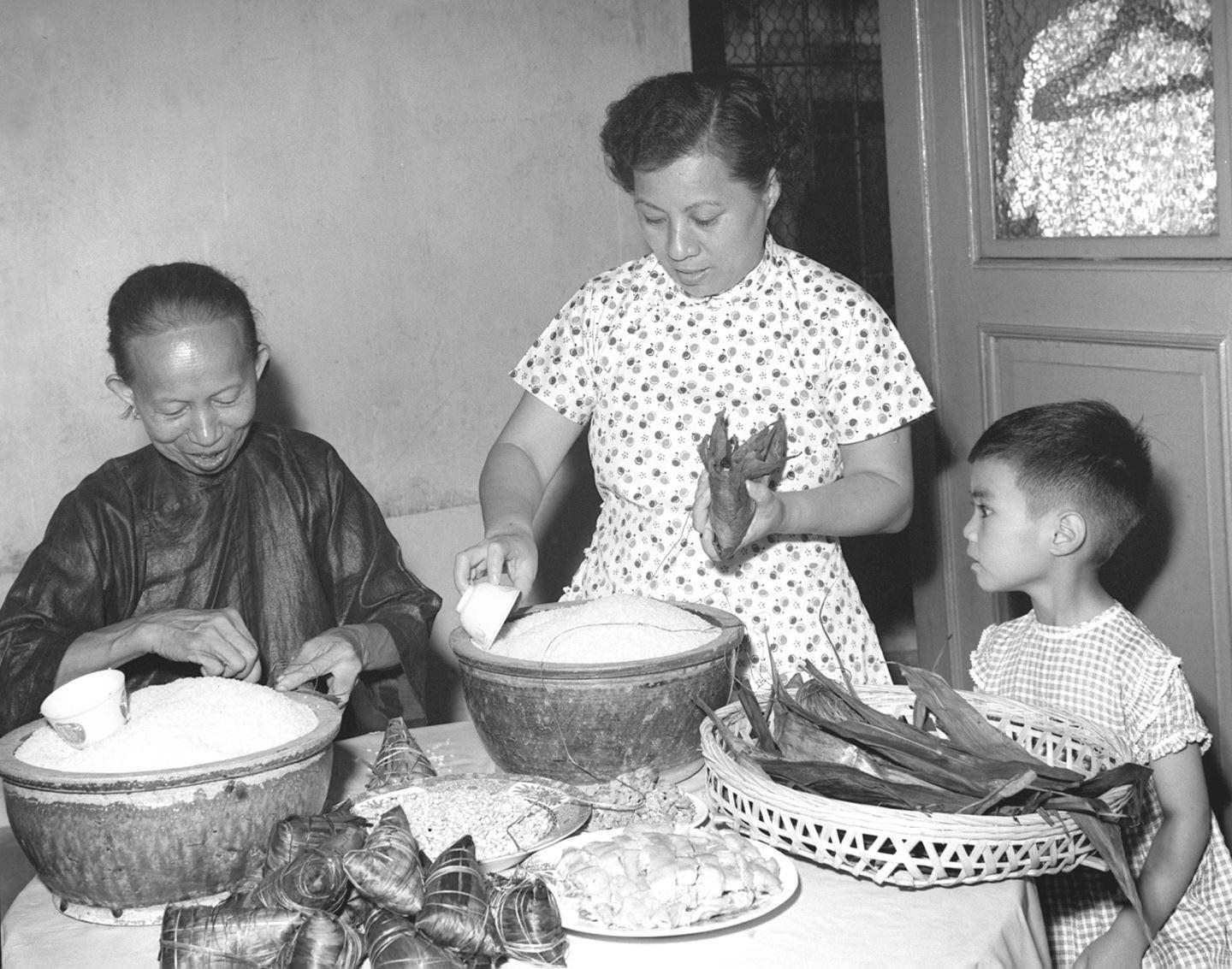 1955年,居住在廣州市華僑眷屬一家人在包粽子。