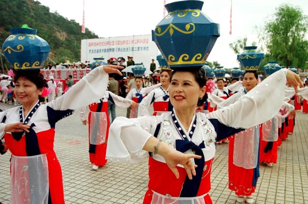 2002年6月15日,人們?cè)诩质〖质信e行第二屆朝鮮族端午民俗藝術(shù)節(jié)上表演“頂水舞”。