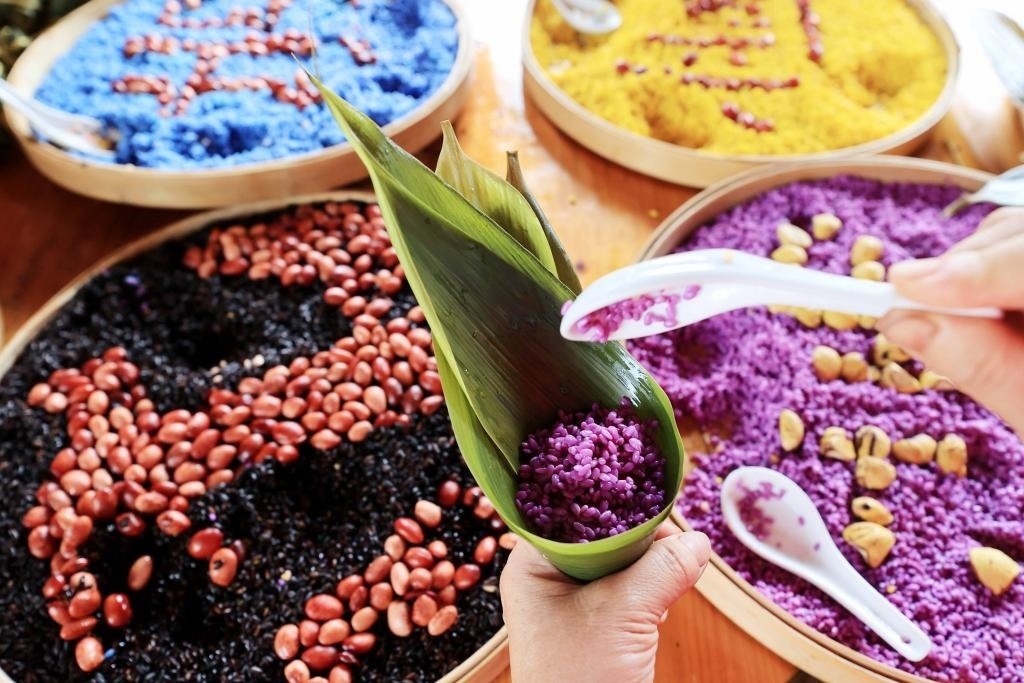 2022年5月25日,在廣西融安縣雅瑤鄉(xiāng)章口村西古坡屯,壯族村民在制作五彩粽,這是用山上生長(zhǎng)的紅藍(lán)草、蘇木等植物煮水取汁后將糯米染色制成的。