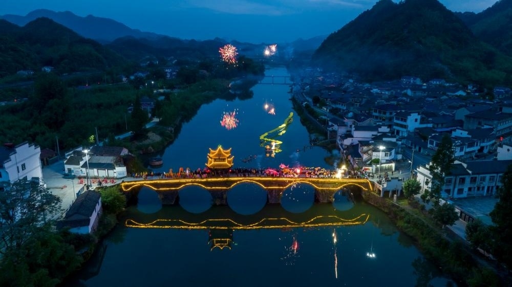2023年6月16日,在安徽省寧國(guó)市胡樂(lè)鎮(zhèn),“魚燈”“河燈”和“龍燈”相互輝映。胡樂(lè)鎮(zhèn)的“魚燈”“河燈”“龍燈”表演歷史悠久,每逢佳節(jié),村民們就自發(fā)組織起來(lái)在鄉(xiāng)村巡回表演。