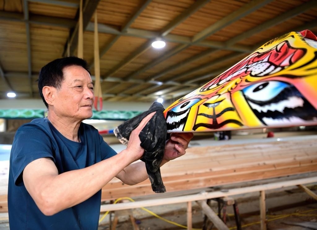 2024年6月3日,福州市非物質(zhì)文化遺產(chǎn)“方莊龍舟制造技藝(閩侯縣)”的傳承人方紹晃在擦拭準(zhǔn)備交付的龍舟船頭。方莊村是福建遠(yuǎn)近聞名的“龍舟村”,制造龍舟的技藝已傳承了700多年,每年有200余艘傳統(tǒng)龍舟銷往全國(guó)及海外。方紹晃介紹說(shuō),制作一艘福州傳統(tǒng)龍舟從原料選擇到制作都非常講究,主要選取閩北山區(qū)樹(shù)齡40年以上的杉木和樟木為原材料,歷經(jīng)做龍骨、釘?shù)装?、裝魚梁、拋光、畫花、上油漆等多道工序,最后裝上精心雕刻的龍頭才算大功告成。