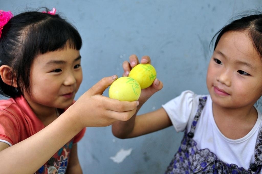 2010年6月13日,福建省莆田市城廂區(qū)第一實(shí)驗(yàn)小學(xué)舉行端午節(jié)傳統(tǒng)習(xí)俗“撞虎蛋”體驗(yàn)活動(dòng)。學(xué)生們?cè)诮?jīng)五味草煮過(guò)的鴨蛋上寫下愿望,然后兩兩相撞,共祈今后更加平安、健康、聰明。這是兩位學(xué)生拿著寫有各自愿望的“虎蛋”相撞。
