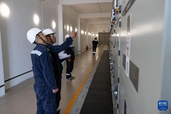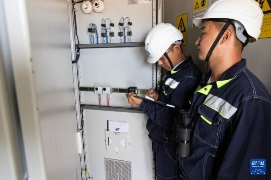 6月25日,在哈薩克斯坦阿拉木圖州謝列克風(fēng)電場(chǎng),中哈運(yùn)行人員進(jìn)行設(shè)備巡檢。白雪騏 攝