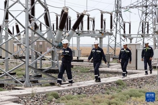 6月25日,在哈薩克斯坦阿拉木圖州謝列克風(fēng)電場(chǎng),中哈運(yùn)行人員進(jìn)行巡檢。白雪騏 攝