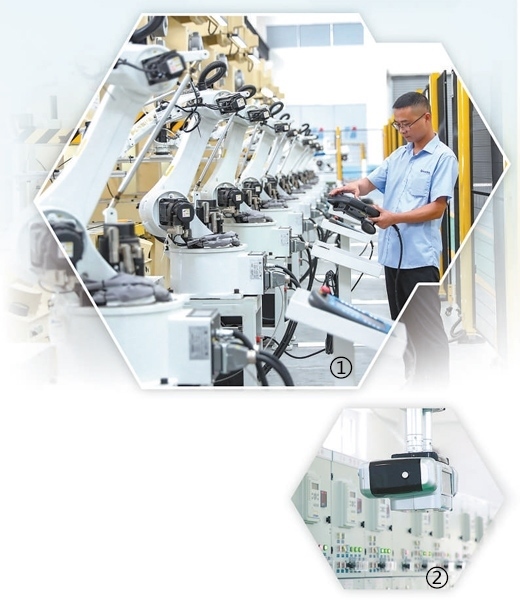 圖①:四川華鎣華鎣山經(jīng)開(kāi)區(qū),企業(yè)員工在智能車間調(diào)試新安裝的機(jī)器人。邱海鷹攝(人民視覺(jué)) 圖②:寧夏銀川金鳳區(qū),智慧配電站房?jī)?nèi)軌道式巡檢機(jī)器人正在開(kāi)展自主巡檢。袁宏彥攝(人民視覺(jué))