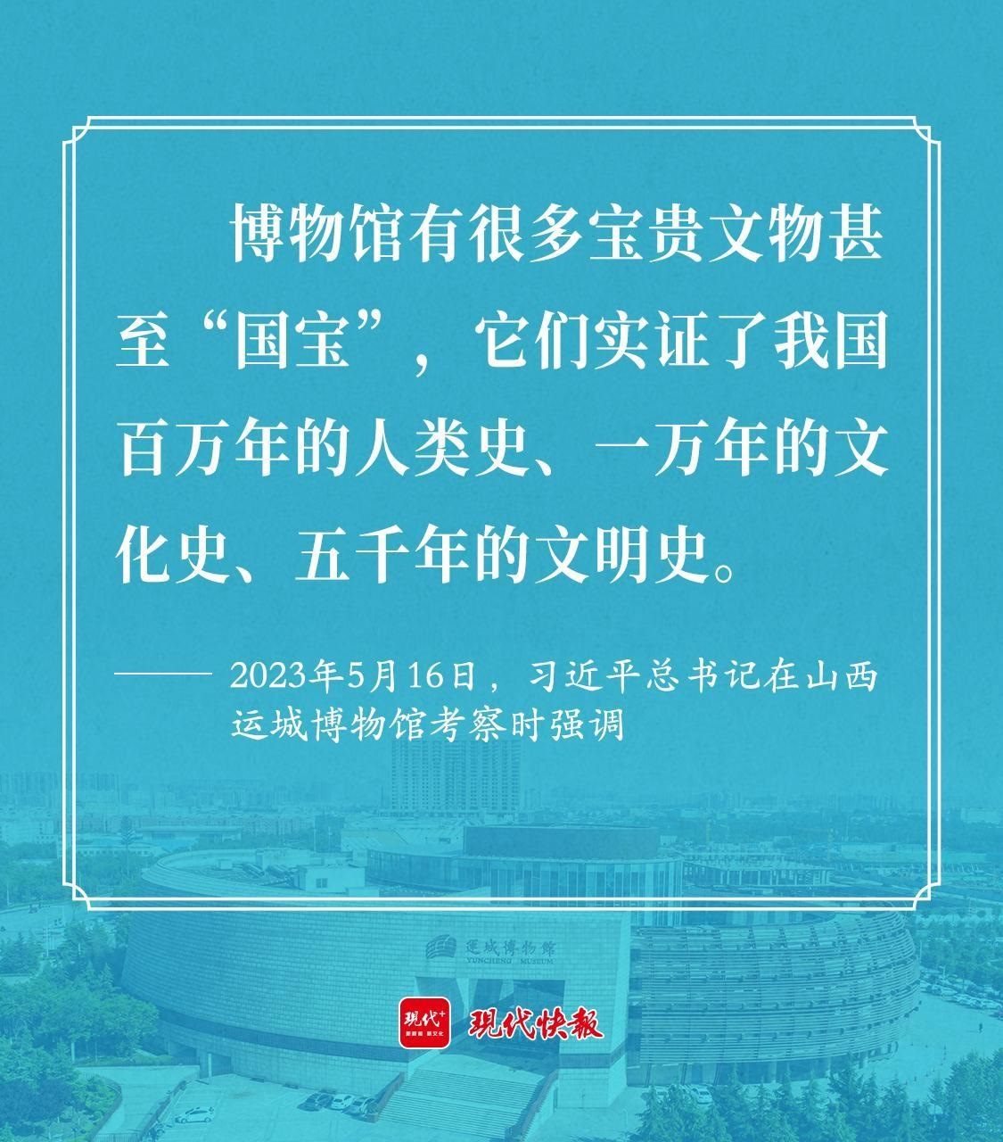 2023年5月16日,習近平總書記考察山西運城博物館時強調,博物館有很多寶貴文物甚至“國寶”,它們實證了我國百萬年的人類史、一萬年的文化史、五千年的文明史。