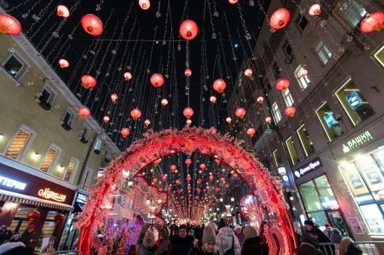 這是2月9日在俄羅斯首都莫斯科拍攝的掛滿中國新年主題裝飾的街道。當(dāng)日,“莫斯科的中國新年”文化活動在俄羅斯首都莫斯科市中心啟動。新華社記者 白雪騏 攝