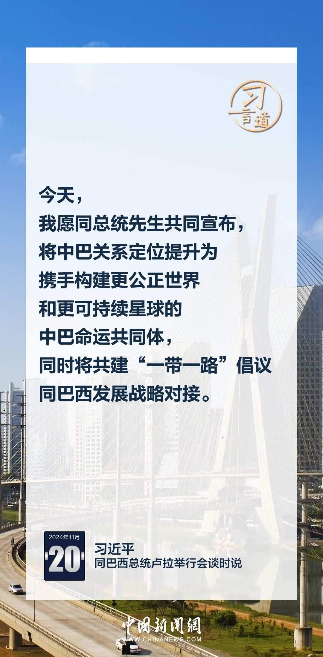 當地時間11月20日,中國國家主席習近平在巴西利亞總統(tǒng)官邸同巴西總統(tǒng)盧拉舉行會談。習近平指出——