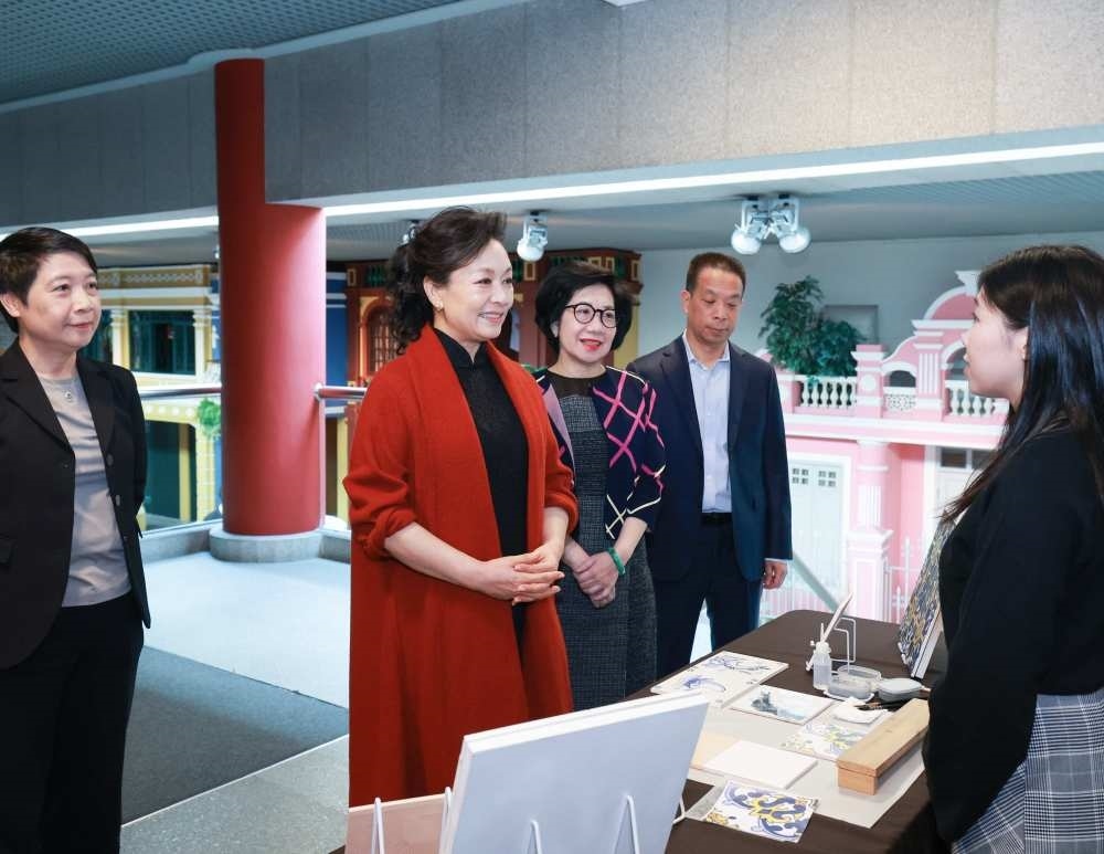 12月19日上午,國家主席習(xí)近平夫人彭麗媛在澳門特別行政區(qū)行政長官賀一誠夫人鄭素貞陪同下,來到澳門博物館參觀。彭麗媛仔細(xì)察看館藏文物,深入了解澳門的歷史變遷和中西交融的建筑、行業(yè)、文化生活等情況,同當(dāng)?shù)卮纱u畫制作、木雕等非遺傳承人親切交流。