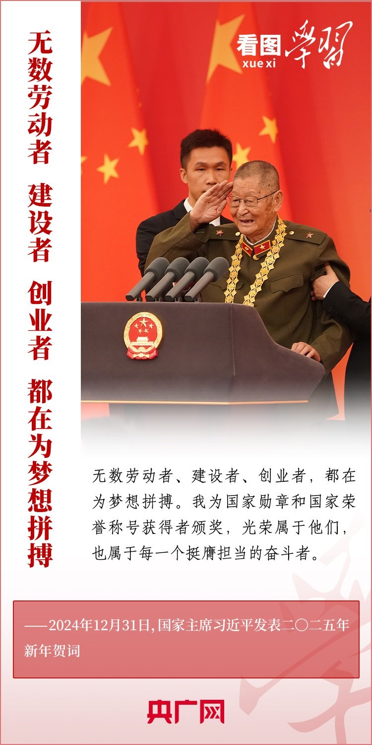 “夢(mèng)雖遙,追則能達(dá);愿雖艱,持則可圓。”新年前夕,習(xí)近平主席發(fā)表二〇二五年新年賀詞。在溫暖有力的講述中,習(xí)主席深情回望過(guò)去一年中國(guó)不平凡的奮斗歷程、精彩瞬間,感慨大家一道經(jīng)歷的風(fēng)雨彩虹、難忘時(shí)刻,贊美無(wú)數(shù)為夢(mèng)想拼搏的勞動(dòng)者、建設(shè)者、創(chuàng)業(yè)者。習(xí)主席說(shuō),中國(guó)式現(xiàn)代化的新征程上,每一個(gè)人都是主角,每一份付出都彌足珍貴,每一束光芒都熠熠生輝。讓我們充滿信心,在新的一年接續(xù)奮斗!