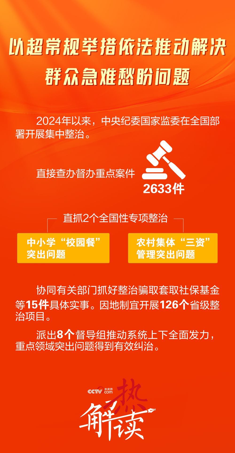 以“校園餐”問(wèn)題為例。2024年,中央紀(jì)委國(guó)家監(jiān)委督促有關(guān)部門(mén)首次摸清全國(guó)中小學(xué)食堂及供餐情況等底數(shù),指導(dǎo)各級(jí)監(jiān)察機(jī)關(guān)依法查處貪占學(xué)生餐費(fèi)、插手招標(biāo)采購(gòu)、收受回扣等問(wèn)題3.8萬(wàn)件,處分2.3萬(wàn)人。在斬?cái)嗌煜颉靶@餐”的“黑手”的同時(shí),補(bǔ)上了監(jiān)管制度的漏洞。中央紀(jì)委國(guó)家監(jiān)委會(huì)同教育部、市場(chǎng)監(jiān)管總局、財(cái)政部等單位,制定“校園餐”管理監(jiān)督指導(dǎo)意見(jiàn),推動(dòng)完善膳食經(jīng)費(fèi)管理等制度,確保每一筆資金來(lái)源與去向都在陽(yáng)光下透明運(yùn)作。