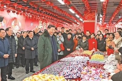 沈陽大東副食品商場歷史悠久,富有特色的年節(jié)商品琳瑯滿目。23日上午,習(xí)近平來到這里,察看多家店鋪,頻頻同店主和顧客交流,詳細(xì)了解節(jié)日期間市場供應(yīng)情況。大家見到總書記都十分激動,連聲歡呼“總書記好”!習(xí)近平對大家說,“菜籃子”、“米袋子”、“果盤子”是民生大事,現(xiàn)在物質(zhì)豐裕,過年團(tuán)圓更要讓大家吃得好、吃得健康。
