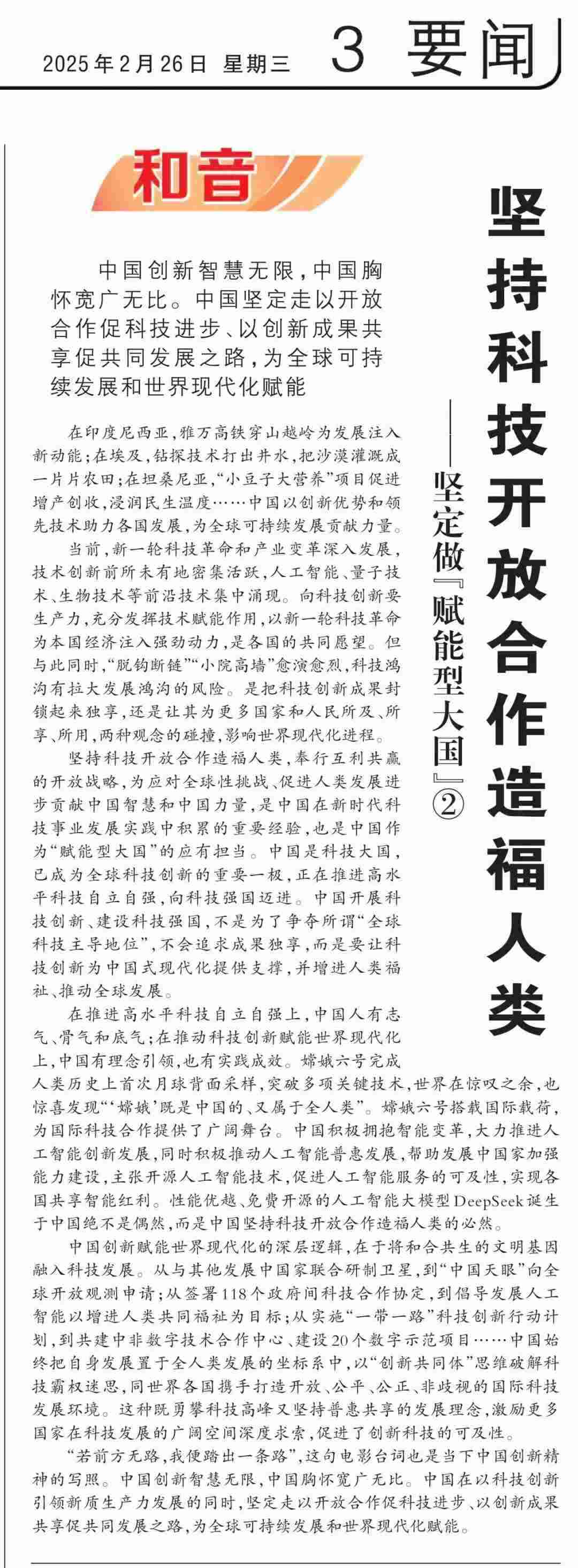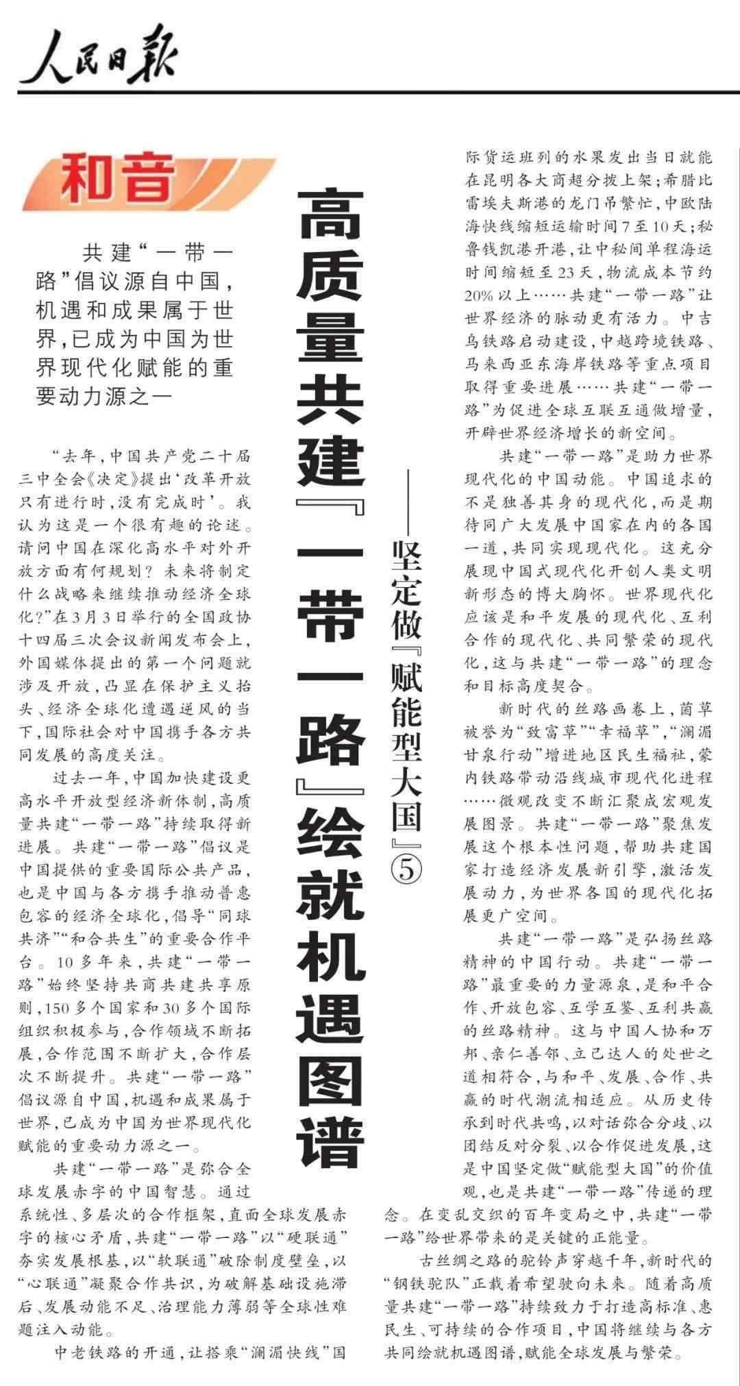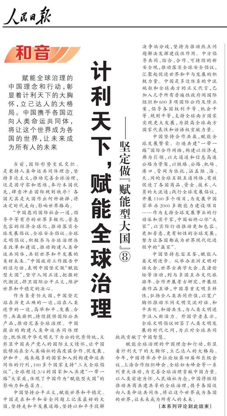 近期,《人民日報》“和音”欄目推出“堅定做‘賦能型大國’”系列評論,圍繞科技創(chuàng)新、開放共贏、綠色轉(zhuǎn)型、高質(zhì)量共建“一帶一路”、多邊治理等熱點議題,從不同角度闡釋中國何以成為一個“賦能型大國”的深層邏輯,展現(xiàn)中國始終秉持構(gòu)建人類命運共同體理念,不斷以中國式現(xiàn)代化為世界現(xiàn)代化賦能的大國擔當。