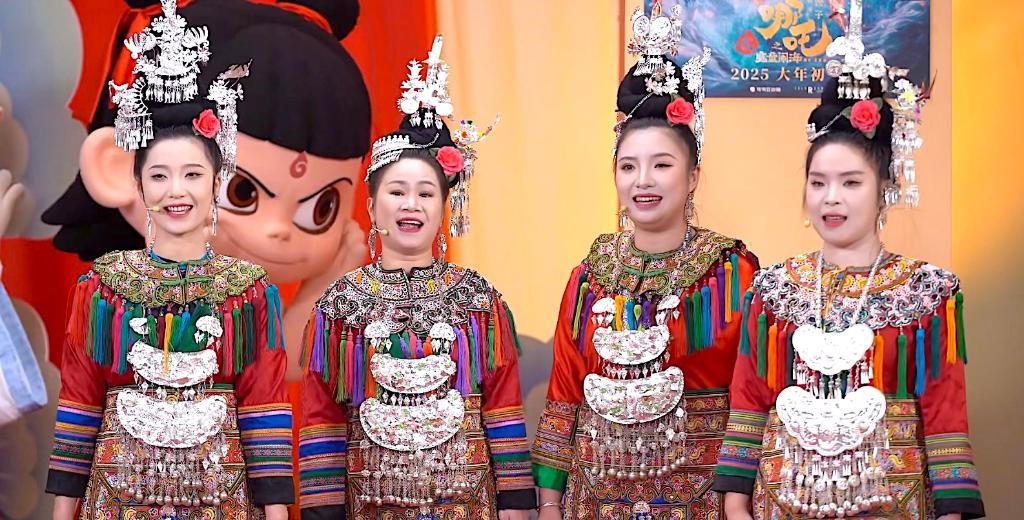 近日,貴州“舞樂蟬歌”樂團(tuán)的成員們,在電影《哪吒之魔童鬧?!返男麓呼[海直播現(xiàn)場(chǎng)表演侗族大歌。(受訪者供圖)