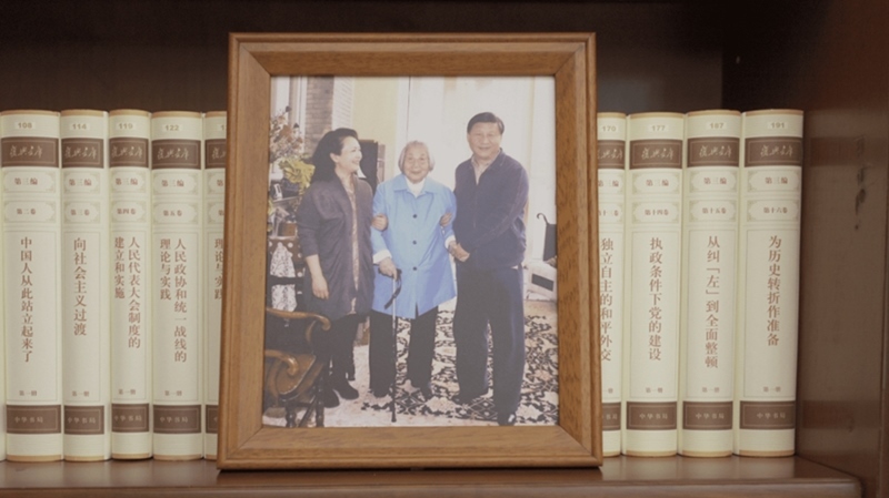 △ 習(xí)近平辦公室的書架上放著一張照片,照片中他和愛(ài)人彭麗媛攙扶著母親。