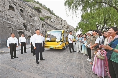 已有1500多年歷史的龍門石窟,是重要的世界文化遺產(chǎn)。習(xí)近平來到這里,察看石窟整體布局風(fēng)貌和代表性窟龕、造像,同現(xiàn)場的文物保護工作者親切交流。他強調(diào),要把這些中華文化瑰寶保護好、傳承好、傳播好。游客們見到總書記,都十分欣喜,紛紛向總書記問好。習(xí)近平不時同大家交流,特別鼓勵小朋友們多到實地尋溯中華文化,從小樹立文化自信。他指出,文旅融合前景廣闊,要推動文旅產(chǎn)業(yè)高質(zhì)量發(fā)展,真正打造成為支柱產(chǎn)業(yè)、民生產(chǎn)業(yè)、幸福產(chǎn)業(yè)。