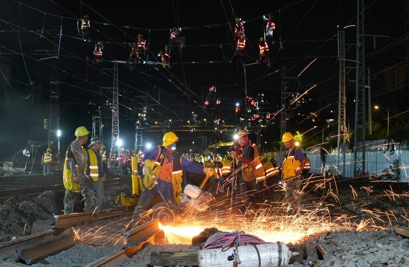 6月19日,在成渝中線高鐵成都站南北站場交替施工現(xiàn)場,中鐵八局施工人員在拆除原來的軌道和枕木,上方中國中鐵電氣化局的施工人員在進行接觸網(wǎng)施工作業(yè)。