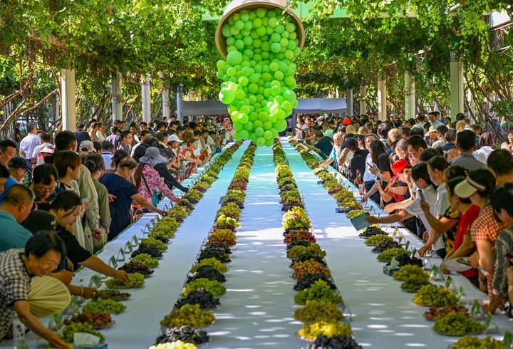 人們?cè)谛陆卖敺厣咸鸭猩掀穱L葡萄(2024年8月17日攝)。新華社記者 陳朔 攝