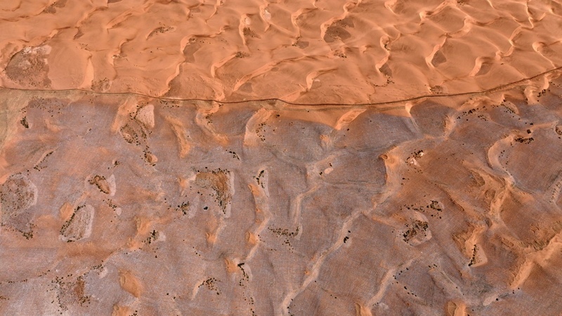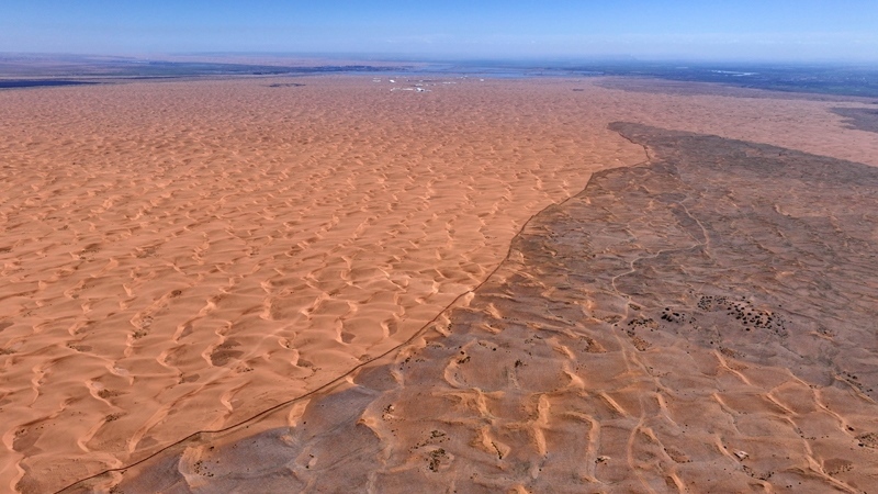 這是6月30日在寧夏中衛(wèi)市長(zhǎng)流水村拍攝的騰格里沙漠東南緣治沙鎖邊工程現(xiàn)場(chǎng)(無(wú)人機(jī)照片)。